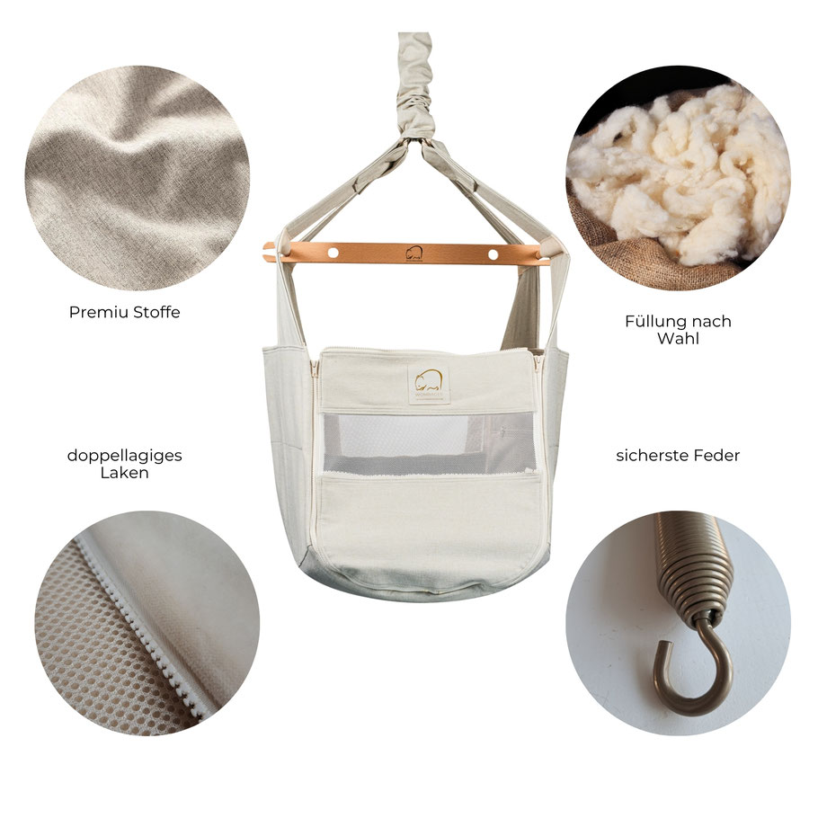 Unsere Federwiege ist aufgrund ihrer Maße und der Umbau-Möglichkeit zu einem richtigen Hängesessel mit Lehne oder zur vollwertigen Hängematte oder zu einem Hängebett mit festem Boden - im Vergleich zu anderen Wiegen sehr lange nutzbar. Wenn dein Kind nicht mehr in der Wiege schlafen möchte, hänge die Wiege einfach ohne Feder in Bodenhöhe auf, so kann dein Kind auch von allein in die Wiege krabbeln. Sie kann später dann wunderbar als Relaxmöbel im Kinderzimmer Verwendung finden – so haben auch noch Kinder im Schulalter Freude mit der Wombagee! Entferne einfach die Feder und baue die Baby-Federwiege mit wenigen Handgriffen zum Hängesessel oder zur Hängematte um!